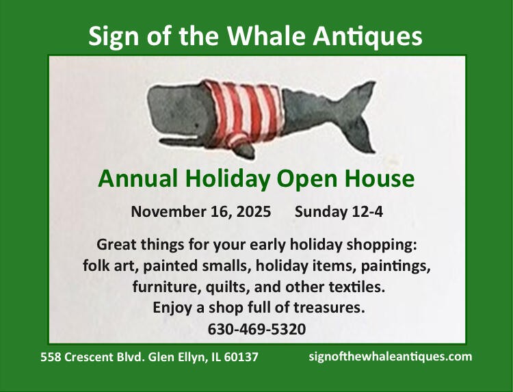 Welcome to Sign of the Whale Antiques. We specialize in 19th century American country furniture, quilts, folk art, lighting, decoys, early glass, yellow ware, and oil paintings, as well as appropriate accessories. Our shop is located in Glen Ellyn, Illinois.